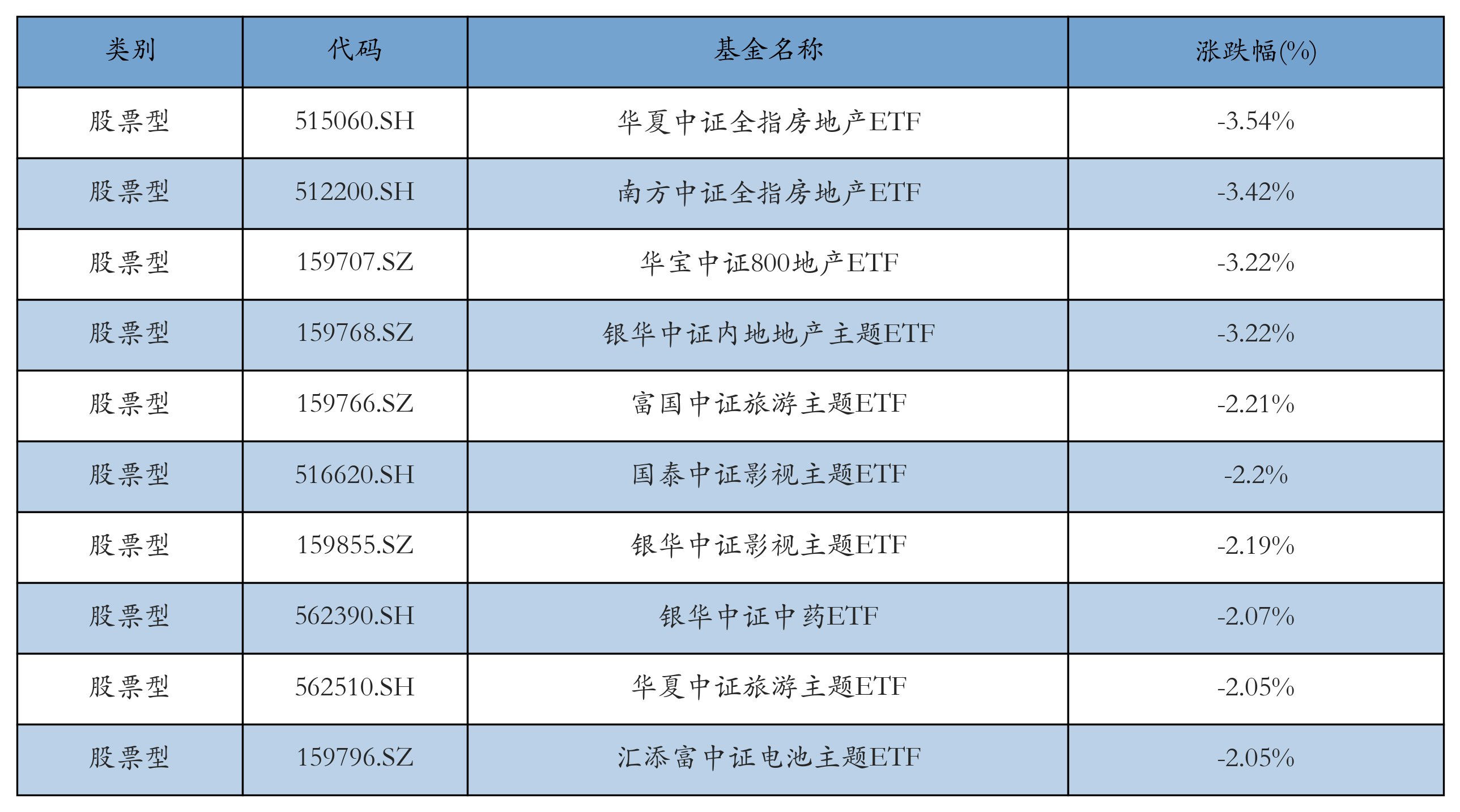 昨日股票型ETF跌幅最大的3支ETF及其收益率分别为:华夏中证全指房地产ETF(-3.54%)、南方中证全指房地产ETF(-3.42%)、华宝中证800地产ETF(-3.22%)。跌幅前10详情见下表: