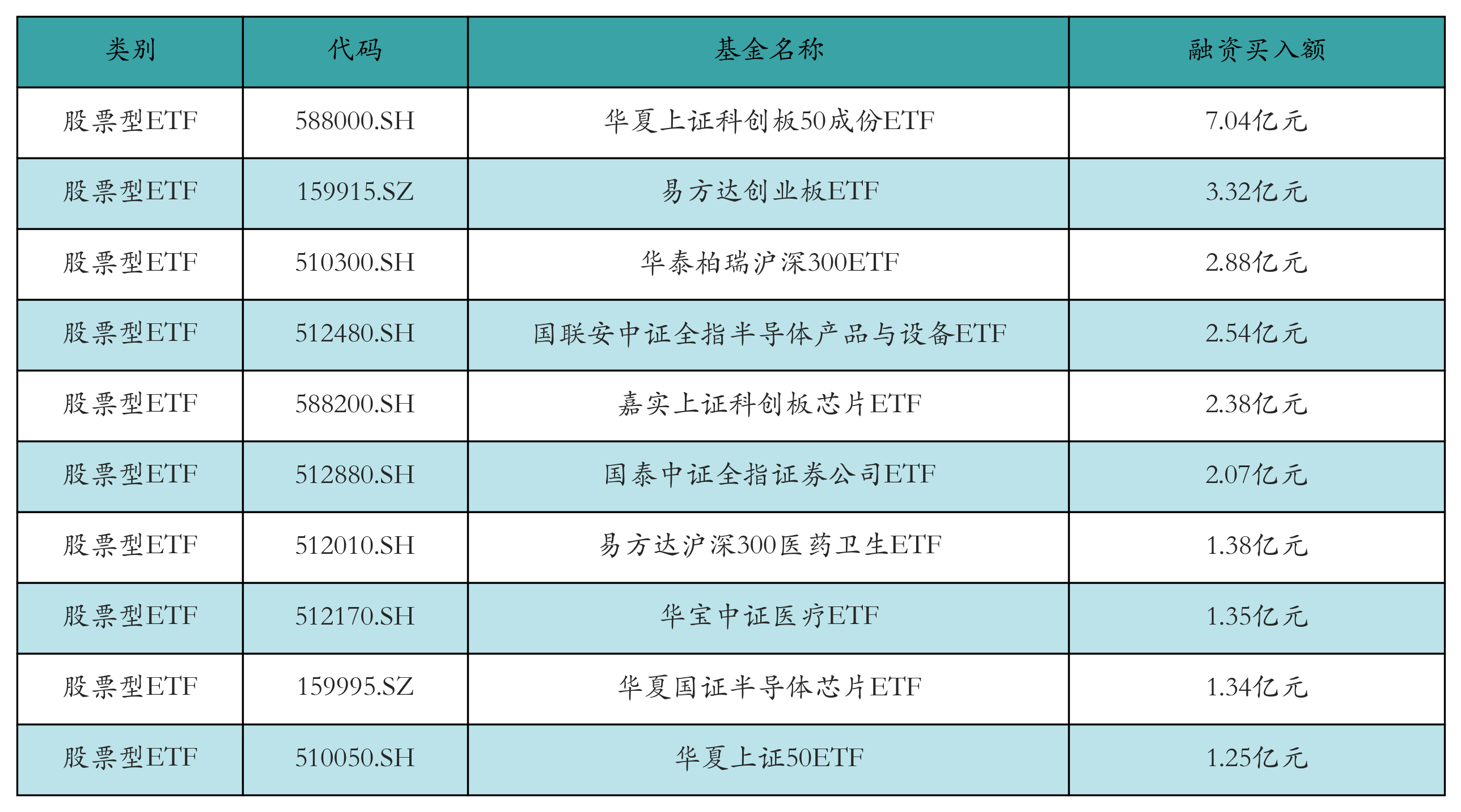 昨日股票型ETF融资买入额最高的3支ETF及其买入金额分别为:华夏上证科创板50成份ETF(7.04亿元)、易方达创业板ETF(3.32亿元)、华泰柏瑞沪深300ETF(2.88亿元)。融资买入额前10详情见下表: