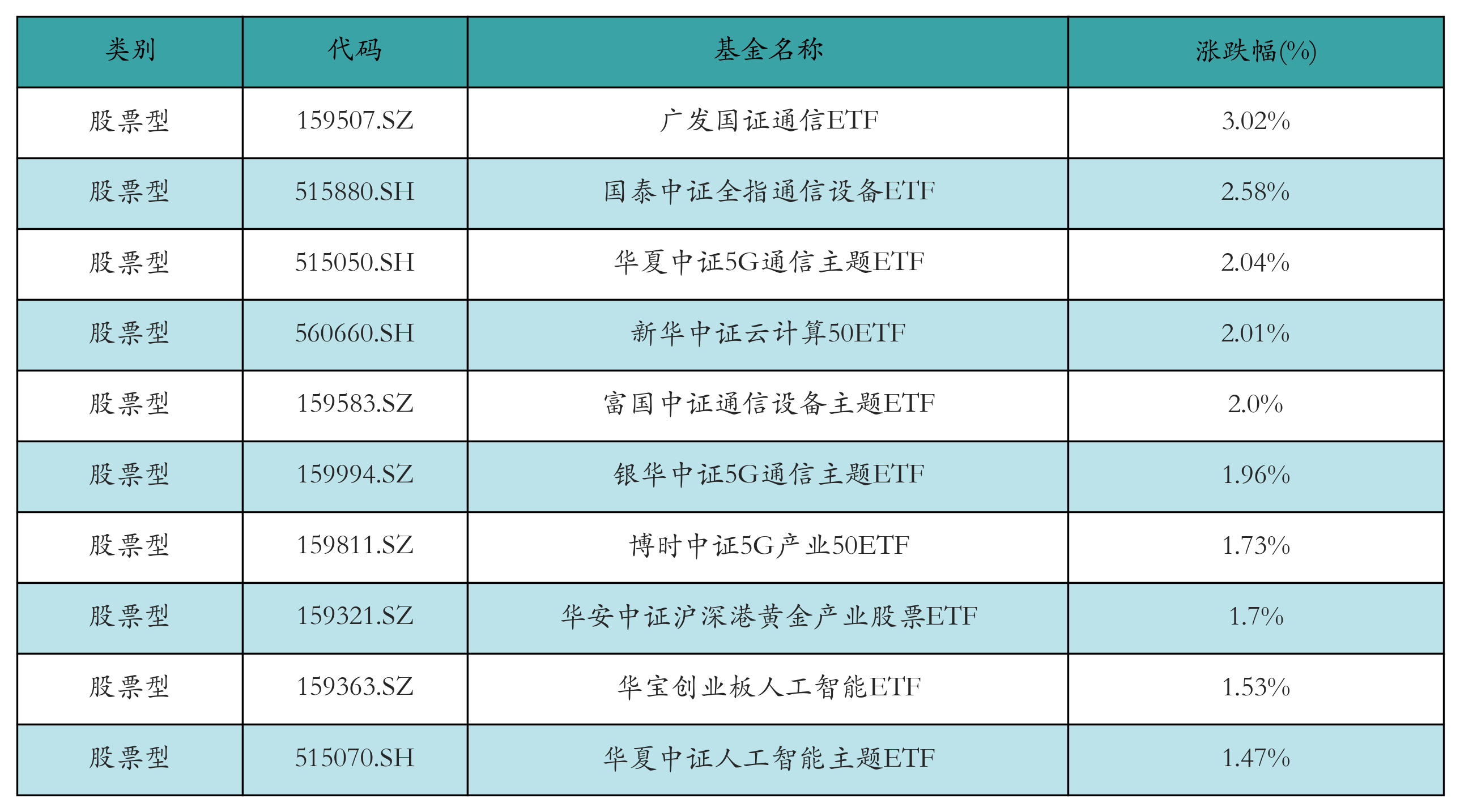 昨日股票型ETF涨幅最高的3支ETF及其收益率分别为:广发国证通信ETF(3.02%)、国泰中证全指通信设备ETF(2.58%)、华夏中证5G通信主题ETF(2.04%)。涨幅前10详情见下表: