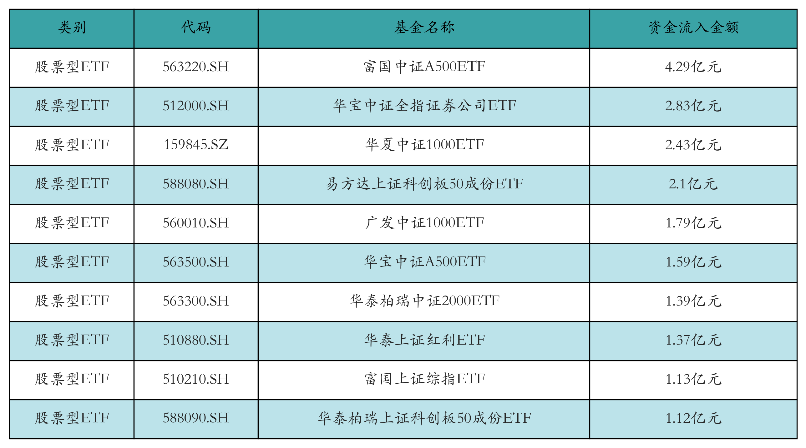 昨日股票型ETF资金流入最多的3支ETF及其流入金额分别为:富国中证A500ETF(流入4.29亿元)、华宝中证全指证券公司ETF(流入2.83亿元)、华夏中证1000ETF(流入2.43亿元)。资金流入前10详情见下表: