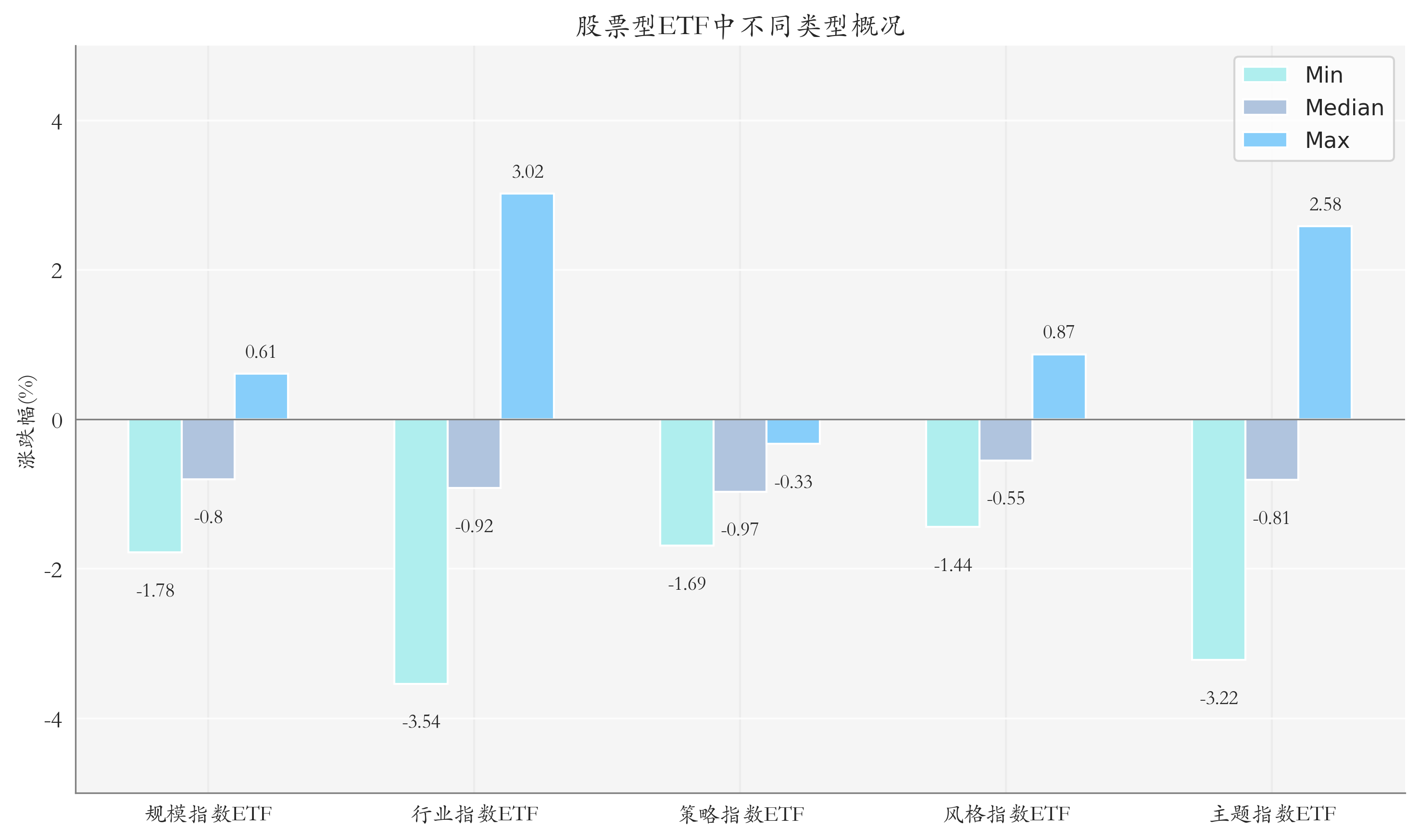 昨日股票型ETF收益率中位数为-0.82%。其中按照不同分类,规模指数ETF中中银证券中证500ETF收益率最高,为0.61%;行业指数ETF中广发国证通信ETF收益率最高,为3.02%;策略指数ETF中华夏中证红利质量ETF收益率最高,为-0.33%;风格指数ETF中华夏创业板动量成长ETF收益率最高,为0.87%;主题指数ETF中国泰中证全指通信设备ETF收益率最高,为2.58%。