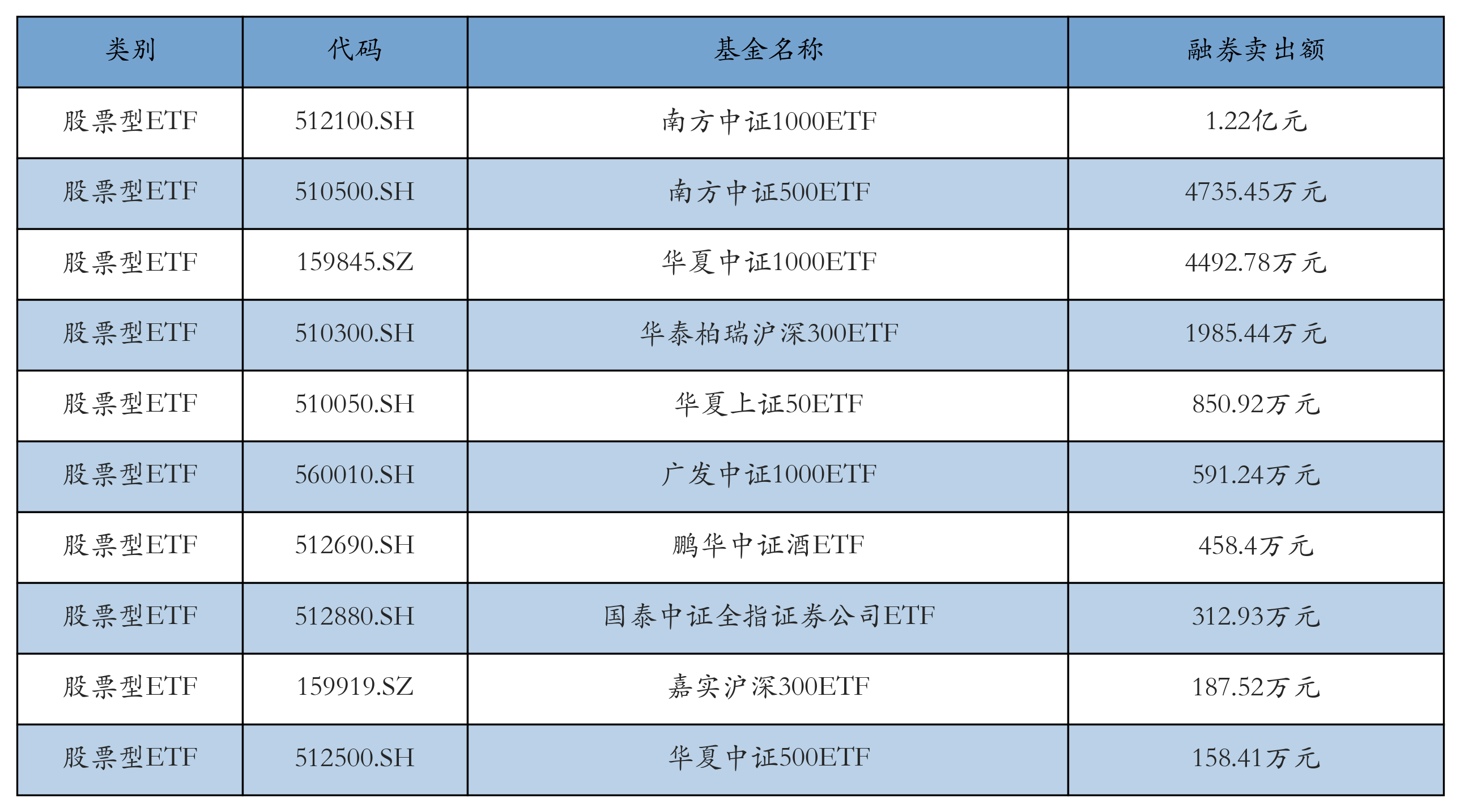 昨日股票型ETF融资卖出额最高的3支ETF及其卖出金额分别为:南方中证1000ETF(1.22亿元)、南方中证500ETF(4735.45万元)、华夏中证1000ETF(4492.78万元)。融券卖出额前10详情见下表: